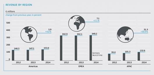 젠하이저의 판매는 전세계 시장에서 고르게 증가했다. 전체 매출의 절반 이상은 EMEA (유럽, 중동, 아프리카) 지역에서 달성됐는데, 이 시장에서는 2.1%의 안정적 성장세를 기록했다. 미주 지역(북미 및 중남미 포함)에서는 4.0%의 성장을 기록하면서 역시 안정적인 성장을 이뤘다.
