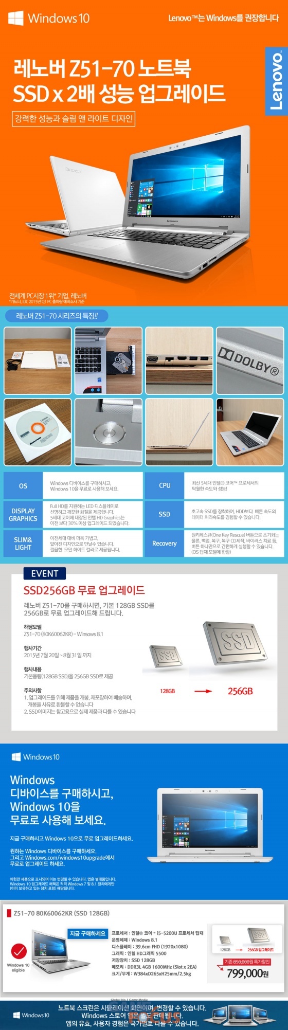 Z51은 얇고 가벼운 디자인에 성능까지 놓치지 않은 슬림 노트북으로 최신 5세대 인텔 코어 i5 프로세서와 기본 128GB SSD를 탑재했다. 또한 돌비 사운드를 지원해 생생한 사운드를 즐길 수 있는 멀티미디어 노트북이다. 이번 프로모션 기간에 Z51을 구매하는 고객은 SSD 256GB로 무료 업그레이드를 할 수 있다. 옥션과 11번가, 지마켓을 통해 진행되는 이번 프로모션은 7월 31일까지 진행된다.