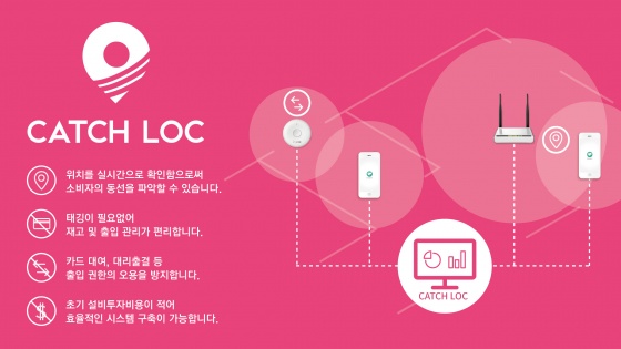 CatchLoc은 빠르고 정확하게 위치를 잡는다는 뜻으로 한정된 공간에서 모바일앱, 비콘, 비콘 스캐너를 활용하여 사물이나 사람의 위치를 실시간으로 포착하여 기업이 원하는 정보를 제공해 줄 수 있다. 또한 병원에서 환자, 마약성 의료약품, 고가의 첨단의료장비 등의 위치를 파악할 수 있으며, 대형 마트에서는 고객의 동선을 빅데이터 분석하여 효율적으로 상품을 진열할 수 있는 방안도 제공해 줄 수 있다. 현재 유통기업 및 보안기업, 실버병원 등 다양한 업체들과 현장 테스트를 진행하고 있으며, 출입관리 및 자산관리에 특화시킨 솔루션을 제공할 예정이다.