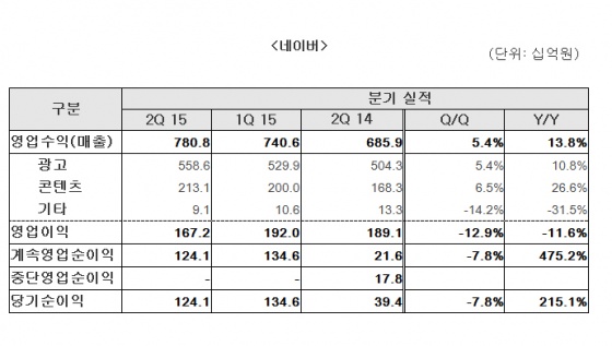 www.navercorp.com)는 2015년 2분기 영업수익(매출) 7,808억 원, 영업이익 1,672억원, 순이익 1,241억 원의 실적을 달성했다고 30일 밝혔다.