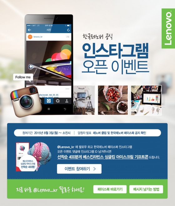 한국레노버는 이번 인스타그램 공식 오픈을 기념해 8월 3일부터 선착순 400명에게 베스킨라빈스 기프트콘을 증정하는 이벤트를 진행한다. 한국레노버 공식 인스타그램 계정을 팔로우하고 페이스북 페이지에 댓글로 인스타그램 아이디를 등록하면 자동으로 응모된다. 이번 이벤트는 제품 소진시까지 진행되며 당첨자는 8월 13일 레노버클럽(http://www.lenovoclub.co.kr/) 및 한국레노버 페이스북(https://www.facebook.com/lenovokorea)에서 확인할 수 있다.