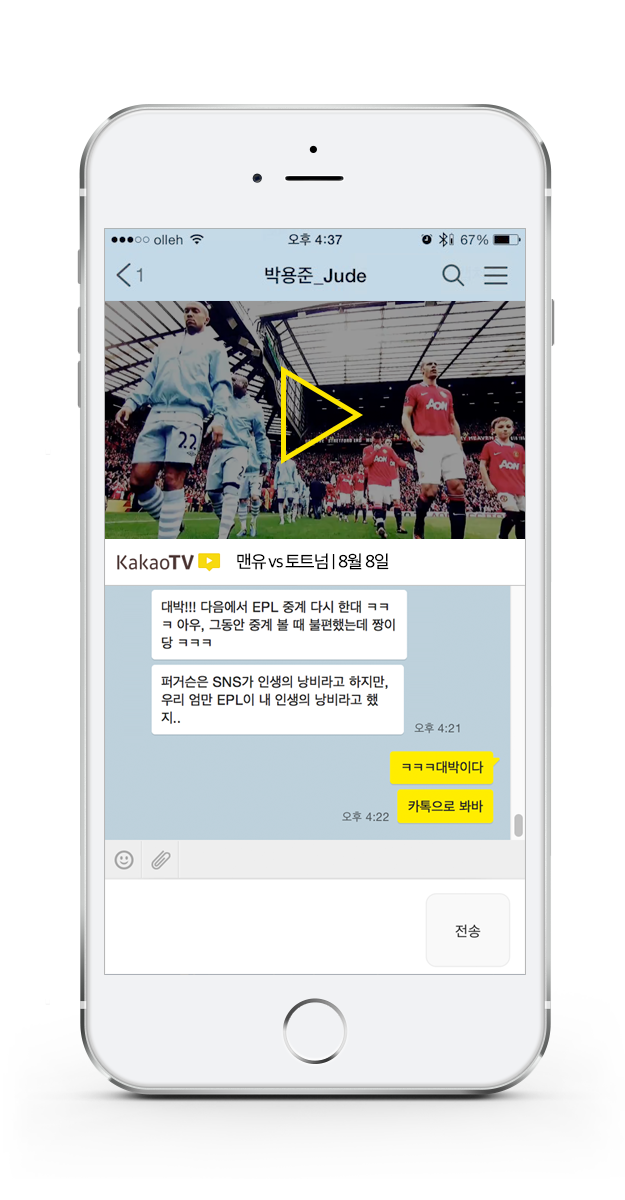 주로 새벽 시간대에 경기가 진행되는 해외 축구를 혼자 보는게 아쉬웠다면 카카오TV가 답이다. 모바일에서 카카오TV를 이용하면 더 이상 혼자 볼 필요 없이 카카오톡 채팅방에 친구들을 모아 함께 경기 관람이 가능하다. 채팅방 내에 실행되는 카카오TV 전용 플레이어로 실시간으로 경기 관람과 동시에 응원 메시지를 주고받는 즐거움을 만끽할 수 있다.