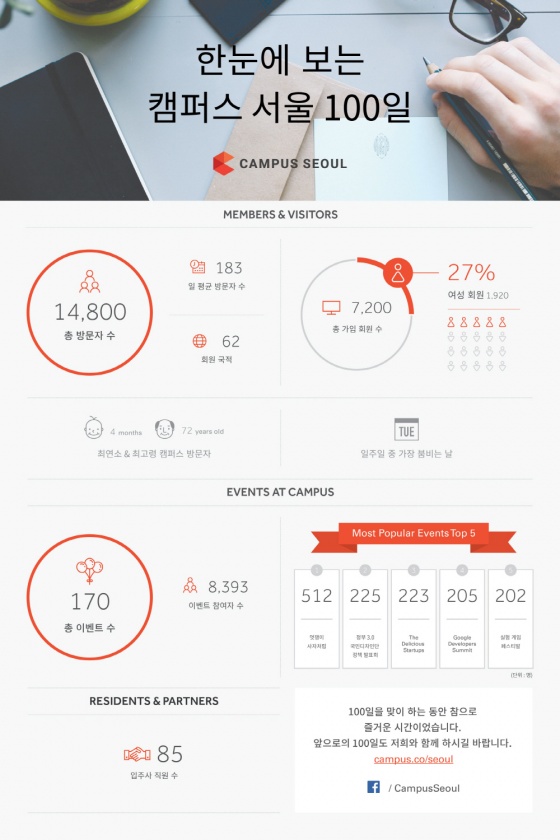 지난 100일 동안 170회가 넘는 이벤트가 열렸으며, 총 8,393명이 참여해 스타트업 커뮤니티에 대한 높은 관심을 엿볼 수 있었다. 캠퍼스 서울에서는 비전공자를 대상으로 프로그래밍 수업을 진행하는 '멋쟁이 사자처럼'과 출산과 육아로 경력이 단절된 여성들을 위한 '엄마를 위한 캠퍼스', 구글 개발자 서밋(Google Developer Summit) 등 다양한 이벤트도 진행됐다.