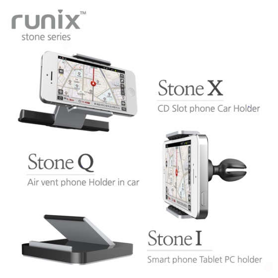CD슬롯에 장착하는 스마트폰 거치대인 스톤X는 360도 상하 볼 마운트 및 각도 조절 알루미늄 마운트 지지대와 견고한 스마트폰 고정을 위한 안티 슬립 패드로 운전시 시야 방해 없는 거치가 가능하다. 자동차의 송풍구에 쉽게 거치하여 사용할 수 있는 스톤Q 제품 역시 360도 상하 회전 볼 마운트를 적용하고 있으며 최대 8.2cm 의 휴대폰을 거치할 수 있다.