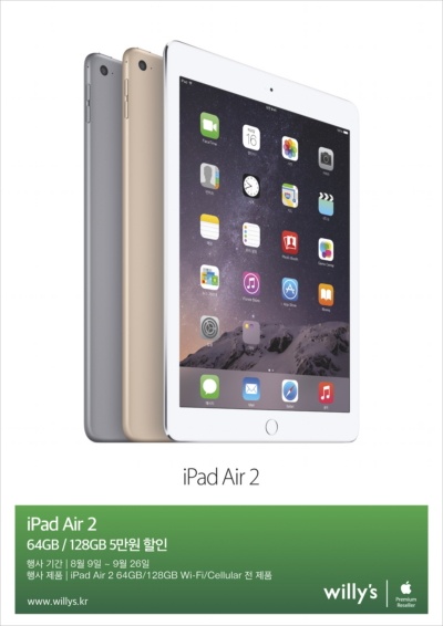 윌리스 (willy's, 대표 공선욱, http://www.willys.kr)는 9월 26일(토)까지 'Apple iPad Air 2' 64GB와 128GB의 가격을 5만원 할인하여 판매하는 '신학기 맞이 iPad 프로모션'을 진행한다.