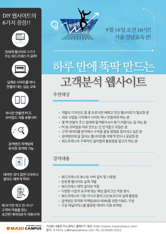 이러한 가운데 마소캠퍼스가 워드프레스를 다운 받아 설치하는 것부터 홈페이지 제작과 검색엔진 최적화 마케팅, 워드프레스 사이트에 구글 애널리틱스 추적 코드를 삽입해 고객 데이터를 분석해내는 전 과정을 다루는 '하루 만에 만드는 고객분석 웹사이트' 실습 프로그램을 마련했다.