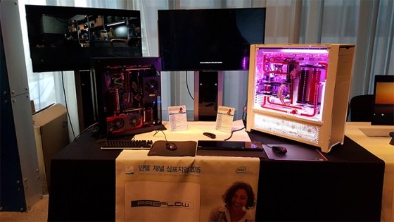 특히 이번 ICS 2015에서 다양한 SI 업체들이 선보인 시스템 가운데 프리플로우(PREFLOW)는 로즈데몬(ROSE DEMON)이라는 이름의 유니크한 시스템을 선보여 많은 관계자들의 주목을 받았다. 커세어의 옵시디언 900D 케이스 전체를 화이트로 새롭게 도색하고 프리플로우 만의 커스텀 수냉솔루션을 채택한 로즈 데몬은 화이트와 레드 두 색상의 환상적이고 아름다운 조화로 세련되고 뛰어난 아름다운 디자인을 보여주고, 수냉 솔루션을 적용하여 하드웨어 성능을 극대화하는 익스트림 시스템의 진수를 선보였다.