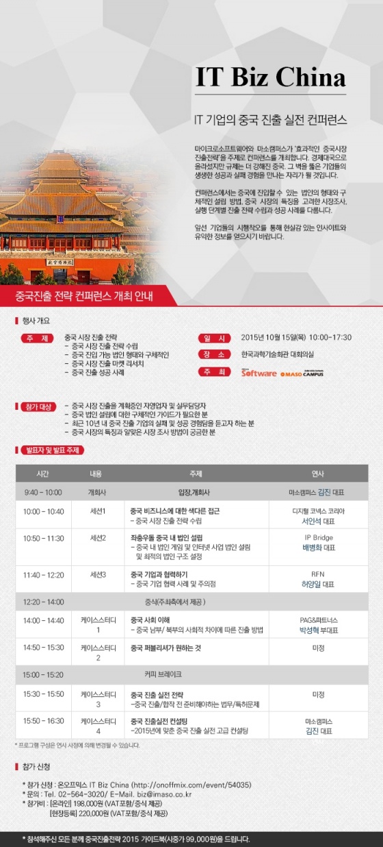 세미나는 오는 10월 15일 한국과학기술회관 대회의실에서 중국 시장 진출을 계획중인 자영업자 및 실무담당자, 중국 법인 설립과 중국 시장의 특징, 알맞은 시장 조사 방법 등 구체적인 사안에 관심 있는 기업체 임직원, 대학생, 연구자, 일반 시민 등이 참석하는 가운데 마소캠퍼스와 마이크로소프트웨어의 공동 주최로 열린다.