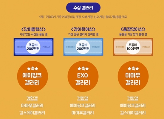 그 결과 가장 많은 사진을 올린 갤러리로는 '에이핑크 갤러리', 가장 많은 갤러가 참여한 갤러리로 'EXO 갤러리', 움짤을 가장 많이 올린 갤러리로는 '마마무 갤러리'가 선정돼 조공비를 차지하는 영광을 얻었다.