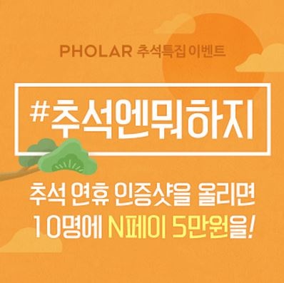 네이버 iSNS 폴라가 오는 26일부터 29일까지 태그를 달고 인증샷을 남긴 이용자들을 선정해 경품을 지급하는 '#추석엔뭐하지' 이벤트를 진행합니다. 이용자는 이벤트 기간 동안 #추석음식 #보름달 #귀성길 등 추석 관련 태그와 함께 연휴의 일상을 담은 사진을 폴라에 업로드하면 된다. 이번 이벤트에 참여한 이용자들의 콘텐츠는 네이버 모바일 검색 결과인 '스냅폴라'에도 노출돼 보다 많은 이용자들과 연휴 일상을 공유할 수 있다. 네이버는 추첨을 통해 총 10명을 선정, 네이버페이 5만 포인트를 제공할 예정이다. 당첨 여부는 오는 29일 개별 알림 메시지를 통해 확인할 수 있다.
