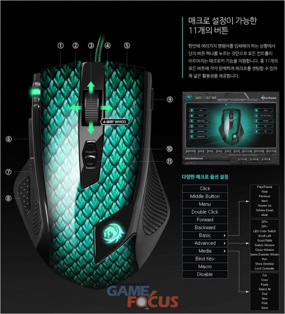 특히나 틸트 기능이 있는 4 WAY 스크롤 휠은 MS 오피스 작업 환경, 이미지 디자인 작업 환경 등 에서 최상의 편리함을 제공해, 드라코니아 블랙 마우스의 가장 큰 장점으로도 알려져 있으며, 11개의 메크로 설정이 가능한 버튼 구성으로 폭 넓은 활용성을 제공한다.