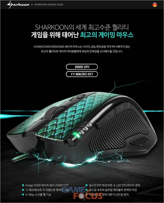 디자인 인 게르마니(DESIGNED IN GERMANY)라는 슬로건 아래 10년 이상 축적된 노하우로 가격 대비 성능비가 뛰어난 제품 개발에 힘써온 이번 샤쿤(SHARKOON)의 드라코니아 그린 마우스는 아바고(AVAGO) 9500센서 5000DPI의 강력한 성능 및 전용소프트웨어 제공으로 마우스 가속 및 더블클릭 속도, DPI셋팅, 전용 인디케이터의 색상 변경, 마우스 폴링율 변경 등 풍부한 옵션을 제공한다.