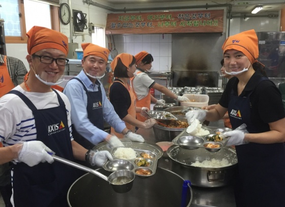 또한 김상준 전무를 비롯한 엑시스코리아 전 직원은 10월 1일 서울 동대문구에 위치한 밥퍼나눔운동 본부를 찾아 직접 무료급식 봉사활동에도 나섰다. 이른 아침부터 오후 2시까지 진행된 봉사활동에서, 엑시스코리아 직원들은 음식 준비, 조리, 배식 등의 역할을 맡아 무료 급식을 제공했다.