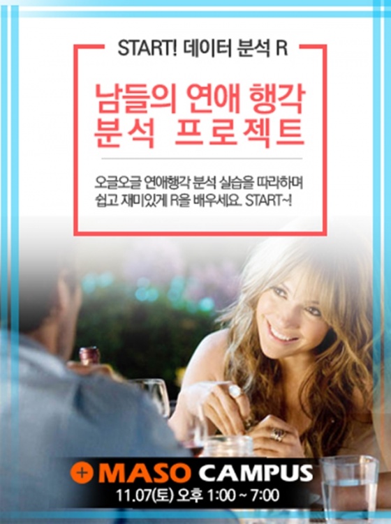 무료로 이용 가능한 R은 비정형 데이터까지도 분석 및 시각화 할 수 있는 강력한 툴이지만 방대한 기능과 어려운 문법으로 대중적으로 접하기에는 어려움이 많았다. 마소캠퍼스가 통계분석 전문 컨설팅 그룹인 히든 그레이스와 함께 마련한 이번 교육에서는 ▷2~30대의 연애행각 분석 ▷영화 제작 프로젝트 ▷한국인의 삶의 질 돌아보기 등 실생활과 밀접한 흥미로운 주제로 쉽고 재미있게 R을 배울 수 있다.
