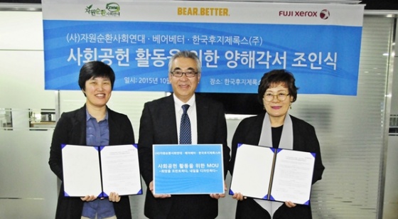 한국후지제록스(사장 우에노 야스아키, www.fujixerox.co.kr)가 시민단체 '자원순환사회연대', 사회적기업 '베어베터'와 함께 '희망을 프린트하다. 내일을 디자인하다' 라는 슬로건 아래 공유가치창출(CSV: Creating Shared Value)을 위한 업무협력 양해각서(MOU)를 체결했다고 21일 밝혔다.