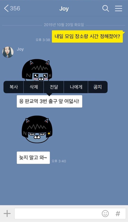 또한, 다른 사람과의 대화 내용을 '나와의 채팅'에 옮겨 기록하고자 할 때는, 해당 말풍선을 길게 누르면 표시되는 '나에게' 버튼을 통해 손쉽게 이동이 가능하다. 채널탭의 콘텐츠 역시 '카톡 친구에게 전달' 기능을 통해 모아둘 수 있다. 대화 입력창 옆 플러스(+) 버튼을 누르면, 사진, 동영상, 카메라, 음성메시지, 연락처, 지도, 선물하기 기능도 활용할 수 있다.