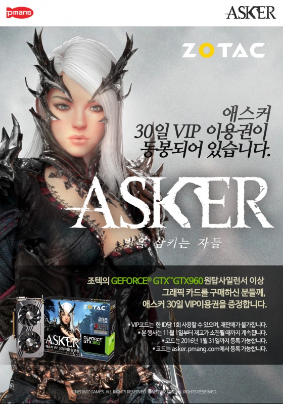 조텍코리아는 지난 11월 3일부터 자사의 지포스 GTX960 이상 그래픽카드를 구매하는 일반 소비자를 대상으로 (주)네오위즈게임즈의 유료 MMORPG 게임인 애스커(ASKER)를 즐길 수 있는 'VIP 30일 이용권'을 증정하는 프로모션을 진행하고 있다. '애스커 VIP 30일 이용권'은 매일 게임 접속 시, VIP 단계에 따른 각종 혜택이 제공되는 상품으로, 스톤, 부활의 코인, 프리미엄 생명 물약 등 유료 아이템을 포함해 각종 혜택을 제공하여 원활한 게임 플레이를 제공한다.