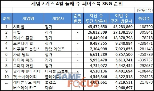 한편, 최근까지 다양한 변동이 있었음에도 불구하고 징가의 게임이 10위권에 7개가 여전히 랭크되어 있어 타사 게임들의 순위권 진입은 여전히 많은 노력이 필요할 것으로 보인다.