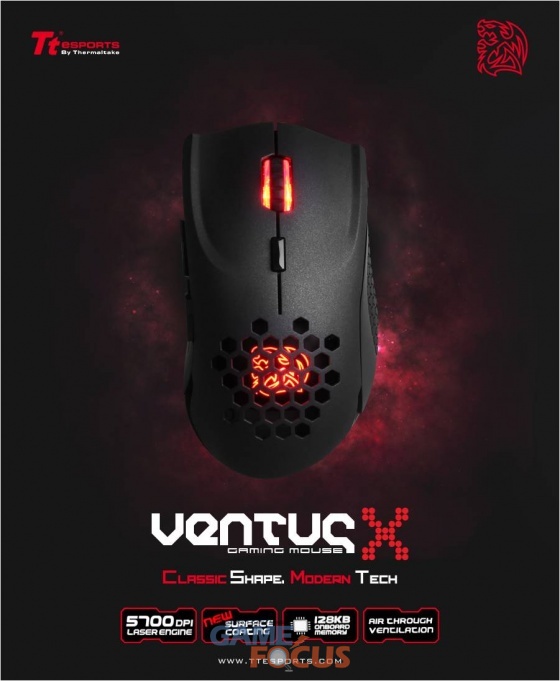 벤투스X(VENTUS X)마우스는 휠 버튼과 티티이스포츠의 로고인 배틀 드래곤(Battle Dragon)에 붉은색 LED를 적용해 블랙의 세련된 본체를 더욱 돋보이게 하며, 500만번 이상 수명의 높은 신뢰도를 보여주는 옴론스위치와 5700DPI의 아바고(Avago)센서를 사용, 게이밍 마우스의 기본에 충실하다.