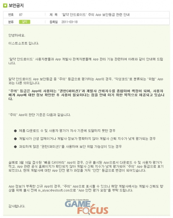 이스트소프트가 '알약 안드로이드' 주의 App 보안등급 관련 안내 보안 공지를 통해 사실상 실수를 인정했다.