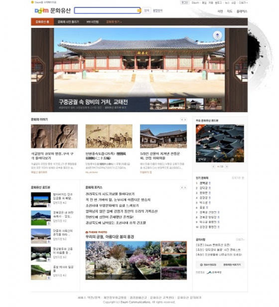 문화재청과 업무 협약을 통해 진행하는 ‘Daum 문화유산’은 다양한 문화재 정보, 문화유산 로드뷰 탐방, 사진, 블로그 리뷰 등을 제공하는 문화유산 포털 서비스이다.