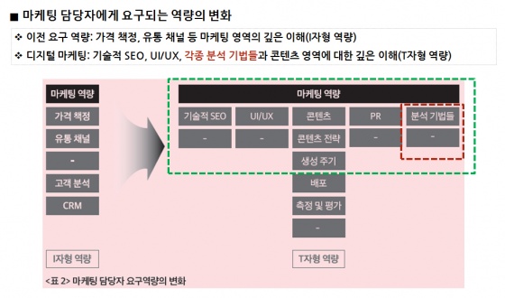 디지털마케팅 필수 역량으로 거론되는 빅데이터 분석이나 소셜 분석을 수학, 통계 전공자만 다룰 수 있는 어렵고 특수한 영역으로 오해하기 쉽다. 그러나 구글 애널리틱스, EXCEL, R, 태블로 등 필요한 툴은 이미 만들어져 있다. 디지털마케팅 전문가는 수학자가 아니다. 목적에 맞는 분석 도구를 선택하고, 간단한 툴 사용법을 익히며, 분석 결과를 정확히 해석하여 실무에 적용하는 능력이 필요하다.