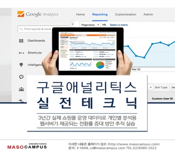 ROI(투자 대비 수익)에 초점을 맞춘 가장 유명한 국내 구글 애널리틱스 교육기관은 마소캠퍼스(http://www.masocampus.com)이다. 마소캠퍼스는 약 4년치 리얼 데이터를 축적한 분석용 개인 웹서버를 제공하는 실습 교육으로 네이버, LG, 삼성, 한국콘텐츠진흥원 등 여러 기업과 공공기관, 대학의 데이터 분석 교육을 전담하고 있다.