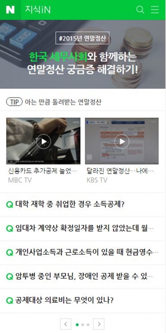 네이버 지식 공유 플랫폼 '지식iN' 모바일이 지난 6일, 연말정산과 관련한 다양한 콘텐츠를 한 데 모아 제공하는 '연말정산 페이지'를 오픈했다.