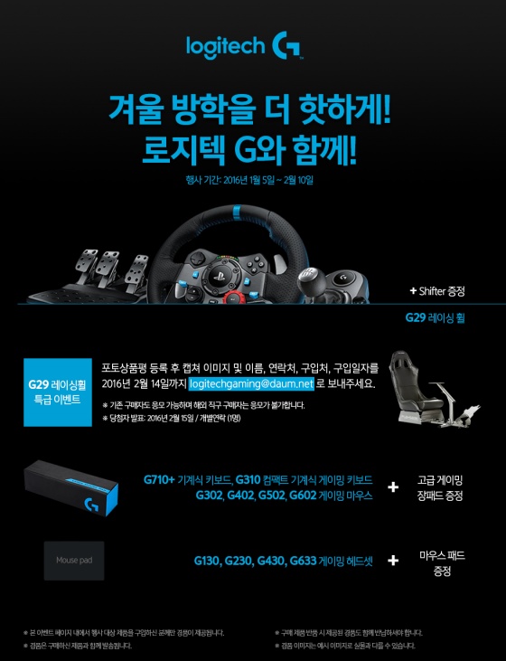'로지텍 G 겨울방학 게이밍 프로모션'은 오는 2월 10일까지 주요 오픈마켓(G마켓, 11번가, 옥션, 인터파크)에서 진행되며, 로지텍의 게이밍 기어 구매 시 다양한 경품을 제공한다. 행사 기간 내 이벤트 페이지 내에서 G29 레이싱 휠을 구매하면 '드라이빙 포스' 6단 수동 시프터를 무료로 증정하고, 구매 후 포토 상품평을 남기고 이벤트에 응모하면 추첨을 통해서 고급 레이싱 시트를 한 명에게 증정한다. 이와 함께 로지텍 게이밍 마우스(G302, G402, G502, G602) 및 기계식 게이밍 키보드(G310, G710+)를 구매한 고객에게는 게이밍 장패드를, 그리고 게이밍 헤드셋(G130, G230, G430, G633)을 구매하면 일반 게이밍 마우스패드를 증정하는 이벤트도 진행된다.