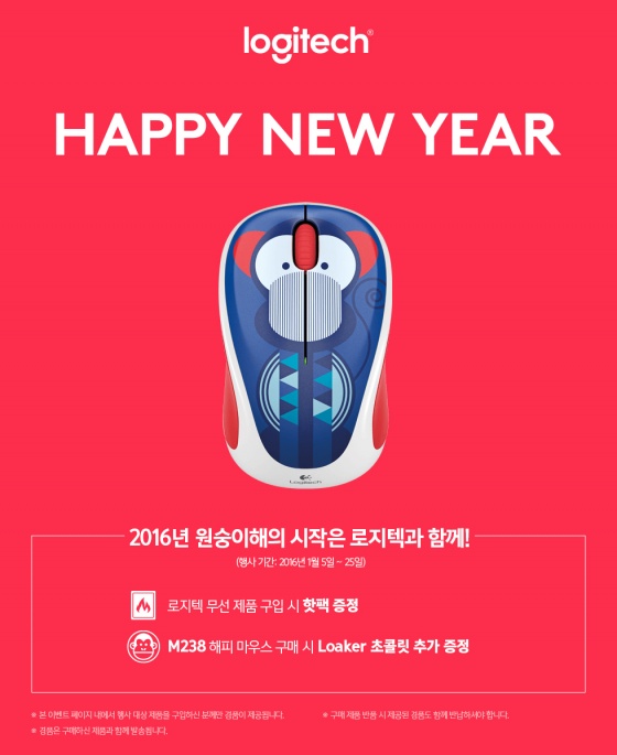 로지텍의 무선 키보드 및 마우스로 진행되는 '해피뉴이어 프로모션'은 오는 1월 25일까지 주요 오픈마켓(G마켓, 11번가, 옥션, 인터파크)에서 진행되며, 행사 기간 내 이벤트 페이지에서 로지텍 무선 모델(M545, M280, M185, MK345, MK270r, MK240, M170, MK23)을 구매한 고객 전원에게 '핫팩'을 선물로 제공한다. 또한, 2016년 원숭이의 해를 맞이하여 귀여운 원숭이 모양을 비롯한 M238 '해피 마우스'를 구매하면 초코릿을 추가로 증정한다.