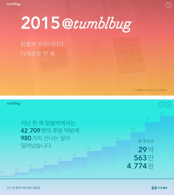 보다 자세한 내용은 온라인과 모바일 페이지로 공개된 ‘2015년 텀블벅 커뮤니티의 다채로운 기록’ 페이지(http://year.tumblbug.com/2015)에서 확인할 수 있다.