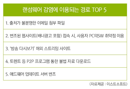 이스트소프트가 지난해 11월부터 올해 1월 15일까지 자체 수집한 자료와 인터넷에 올라온 사용자 랜섬웨어 피해 사례 게시글을 종합적으로 분석한 결과, 사용자가 랜섬웨어 감염 피해를 당한 감염 경로는 ▲출처가 불분명한 이메일 첨부 파일 열람, ▲DBD(Drive by Download, 변조된 사이트 접속/주요 인터넷 커뮤니티 배너 광고), ▲애드웨어 서버 변조, ▲해외 불법 스트리밍 사이트 접속, ▲토렌토 등 불법 P2P 프로그램 사용 등으로 나타났다.