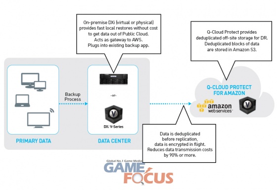 'Q-Cloud Protect'는 아마존 클라우드 에서 가상화된 오프사이트 중복제거 스토리지를 제공하며, 재해로부터 기업을 보호한다. 또한, DR을 위해 오프사이트로의 테이프 전송 방식 보다 간편한 대안을 제시한다.