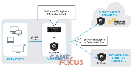 데이터 보호를 위한 베스트 프렉티스(best practice)는 메인 데이터 센터로부터 100마일 이상의 거리에 데이터 복사본을 저장하는 것이다. 'Q-Cloud Protect'를 통해 데이터는 가용한 아마존 데이터 센터에 중복제거된(deduplicated) 형태로 저장되며 재해 시 복구될 수 있다.