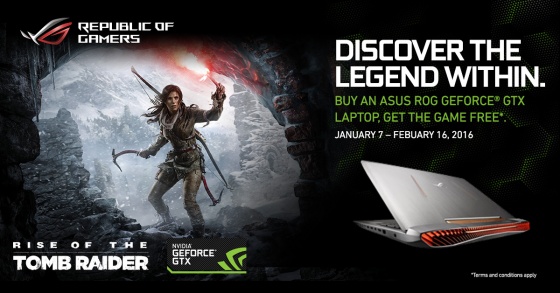 오는 2월 16일까지 에이수스의 게이밍 노트북 브랜드 ROG(Republic Of Gamer) 제품 중 GTX 970M, 980M, 980 그래픽 카드가 탑재된 ROG G752VY, G752VT의 제품을 구매하는 고객은 라이즈 오브 더 툼레이더의 정식 한글판 PC 버전을 무료로 다운받을 수 있다. 게임 코드 만료일은 2016년 4월 16일이다.