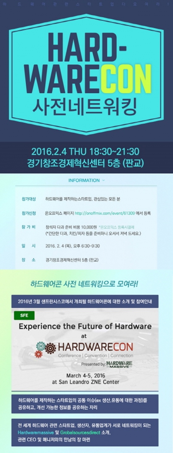 하드웨어콘은 하드웨어를 제작하는 스타트업들의 공통 이슈인 생산〮유통 과정 등에 대해 공유하고, 개선 가능한 정보를 공유하는 행사다. 이 자리에서는 전세계 하드웨어 관련 스타트업, 생산자, 유통업계가 서로 네트워킹이 되는 Hardware massive, Grobal sourece direct 소개, 관련 CEO 및 매니저와의 만남의 장 등 다양한 부대행사가 꾸려진다.