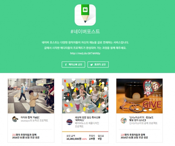 네이버의 모바일 콘텐츠 창작 플랫폼 포스트에서 활발하게 활동 중인 6팀의 에디터들이 소셜펀딩 플랫폼 '텀블벅'에서 자신이 만든 개별 프로젝트의 목표액을 달성하며 콘텐츠 경쟁력을 확인했다.