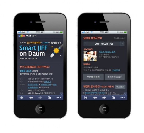 이번에 웹과 모바일에 오픈한 전주국제영화제 특별페이지(m.movie.daum.net/mobile/special/jiff2011.do)는 ▲날짜별 상영시간표, ▲화제작 미리보기, ▲오늘의 추천 프로그램 및 실시간 이슈, ▲영화제 현장 로드뷰 및 맛집 정보를 생생하게 제공한다.