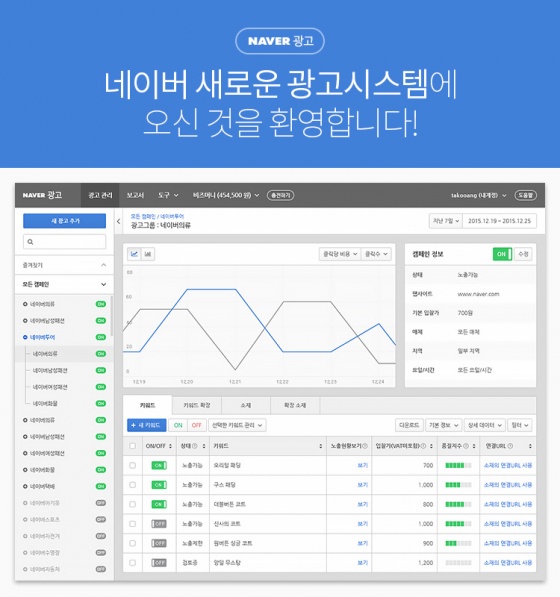 또, 광고 목적에 따라 예산이나 기간 등을 설정해두는 '캠페인' 단위를 신설하고, 광고주가 목적에 따라 유연하게 광고를 운영할 수 있게 했다. 예를 들어, 의류를 판매하는 광고주가 상품 할인 이벤트를 기획하고 있다면 "세일 캠페인"을 설정하고 이에 맞는 광고 채널과 검색어, 문구를 별도로 운영하는 식이다. 향후 '파워컨텐츠'나 '상품광고', '쇼핑광고' 등의 시스템도 통합되면 한 번 설정한 캠페인을 원하는 광고 상품에 선택, 적용할 수 있게 된다.
