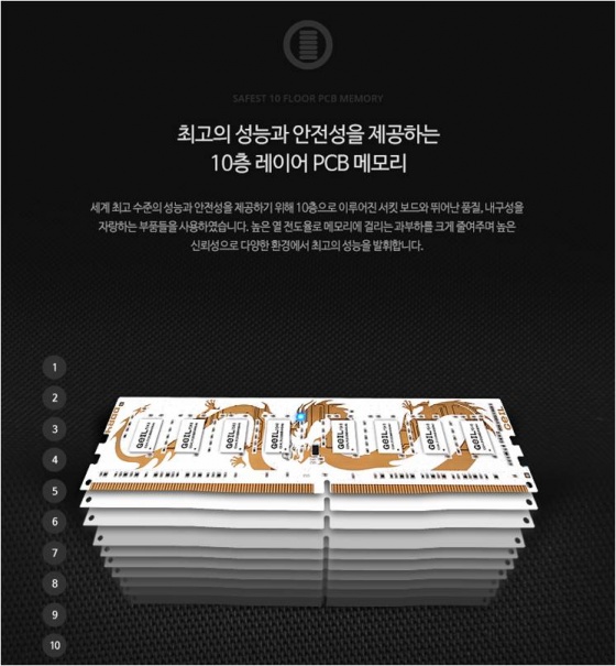 방열판이 없는 게일(GEIL)사의 드래곤 DDR4 25600은 세계최고 수준의 안정성 및 성능을 제공하기 위해 10층 레이어 PCB기판을 사용, 일반적인 6층과 8층의 적층 구조 제품보다 뛰어난 안전성을 자랑한다.