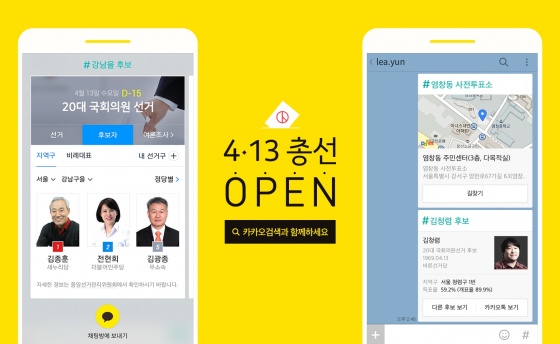 카카오는 유권자들이 언제 어디서나 선거 관련 정보를 손쉽게 접할 수 있도록 다음앱과 카카오톡 샵(#)검색을 통해 ▲선거 일정, 투표 절차 등의 정보가 담긴 '선거', ▲지역구, 비례대표 후보자의 프로필, 선거이력을 볼 수 있는 '후보자', ▲내 투표소 위치를 확인할 수 있는 '투표소', ▲화제의 지역구, 지역 별 여론조사 결과를 공개하는 '여론조사'와 같은 풍성한 검색 결과를 제공한다.
