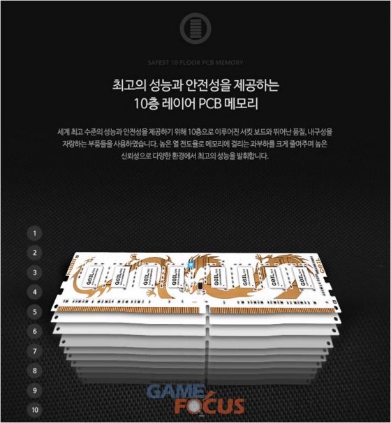 방열판이 없는 게일(GEIL)사의 드래곤 DDR4 28800은 세계최고 수준의 안정성 및 성능을 제공하기 위해 10층 레이어 PCB기판을 사용, 일반적인 6층과 8층의 적층 구조 제품보다 뛰어난 안전성을 자랑한다.