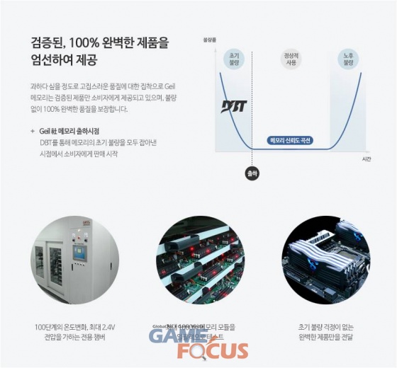게일사는 과하다 싶을 정도로 고집스러운 품질에 대한 집착으로 독자 테스트 환경으로 유명하다. DBT(Die Hard BURN-IN Technology)라는 독자 테스트 시스템을 통해 게일사가 독자 개발한 버닝챔버 안에서 일정 온도 이상의 극도의 고열에서 모듈 테스트를 통과한 제품만 선정하여 제품을 출하, 불량율 0% 및 어떤 시스템 환경도 버텨낼 수 있는 제품 개발 및 생산을 목표로 하고 있다.