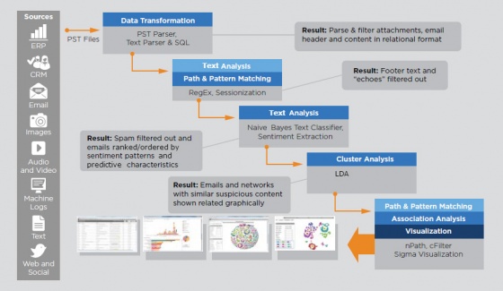 특히 커뮤니케이션 컴플라이언스 분석 솔루션(Communication Compliance Analytic Solution)은 다른 여러 컴플라이언스 솔루션과는 다른 접근방식을 취하고 있다. 이 솔루션은 머신 러닝(Machine Learning), 텍스트 분석, 패턴 인식, 그래프 분석, 애드 혹(ad hoc) 분석을 포함해 멀티-장르(multi-genre) 고급 분석 기법을 적용하여 용량에 상관없이 기업 내 모든 메시지와 첨부 파일을 자동 확인하는 정교한 예측 모델을 기반으로 한다. 테라데이타 컨설턴트들은 디지털 메시징 아카이브에 대한 고객들의 준비 상태를 파악하고, 귀중한 기회 영역을 확인하며, 기대되는 개선효과를 가늠하고, 기준 위반 커뮤니케이션 활동을 확인할 수 있는 네트워크 그래프를 제공한다.