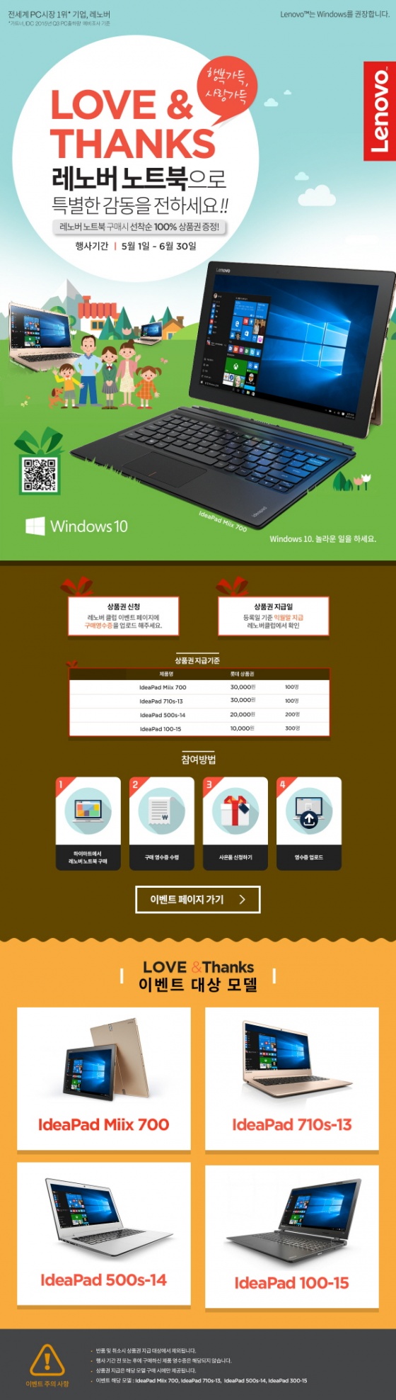 이벤트 대상 제품으로는 12형 투인원 노트북인 '아이디어패드 믹스 700(IdeaPad Miix 700)', 뛰어난 속도와 경량을 자랑하는 13형 '아이디어패드 710S(IdeaPad 710S)', 성능과 휴대성을 모두 만족시키는 멀티미디어 14형 노트북 '아이디어패드 500S(IdeaPad 500S)', 경제적인 가격에 높은 안정성과 생산성을 제공하는 15형 '아이디어패드 100(IdeaPad 100)'이 포함된다. 특히 '아이디어패드 믹스 700'은 고성능과 스타일리시한 디자인을 겸비한 투인원 노트북으로, 풀HD IPS 고릴라 글래스와 독특한 손목시계 밴드 힌지를 채택해 차별화를 꾀한 것이 특징이다.