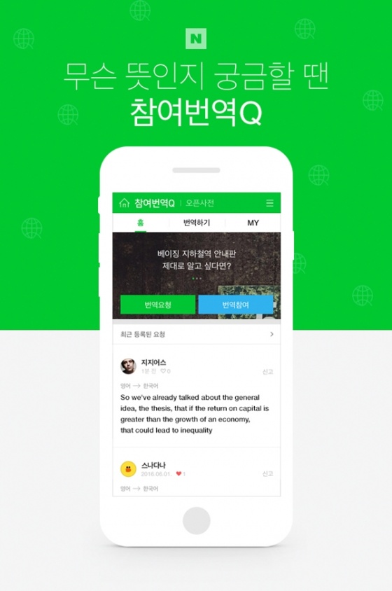 모바일 네이버 사전에서 이용자들이 외국어 예문을 직접 번역 요청하거나 참여할 수 있는 '참여번역Q' 서비스를 새롭게 선보인다.