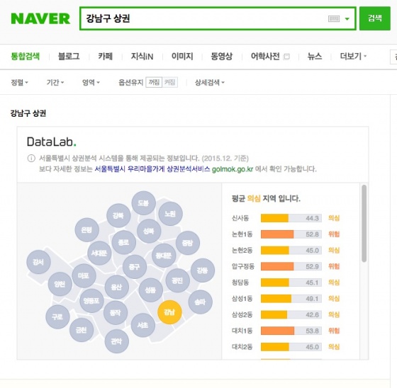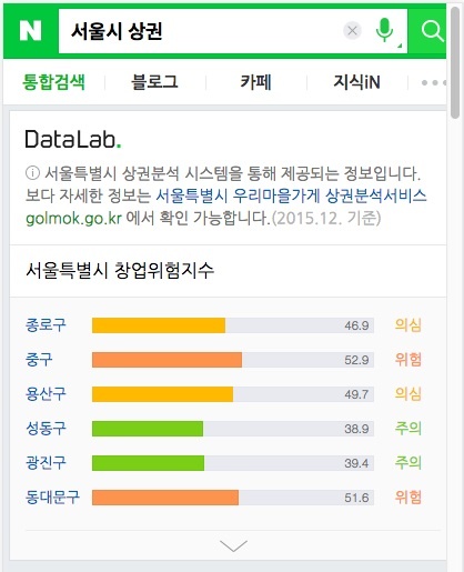 네이버는 서울시 내 25개 구 대상, 43개 업종을 분석한 지역별 창업위험지수 공공 데이터를 네이버 검색결과에서 별도의 '데이터 랩(Data Lab.)' 영역을 통해 제공한다. 예를 들어, 네이버 모바일 및 PC 검색창에 '서울시 상권' '은평구 상권' '강남구 상권' '용산구 상권' 등 지역별 상권을 입력하면, 해당 지역의 창업위험지수를 그래프와 수치 형태로 간편하게 만나볼 수 있는 형태다.