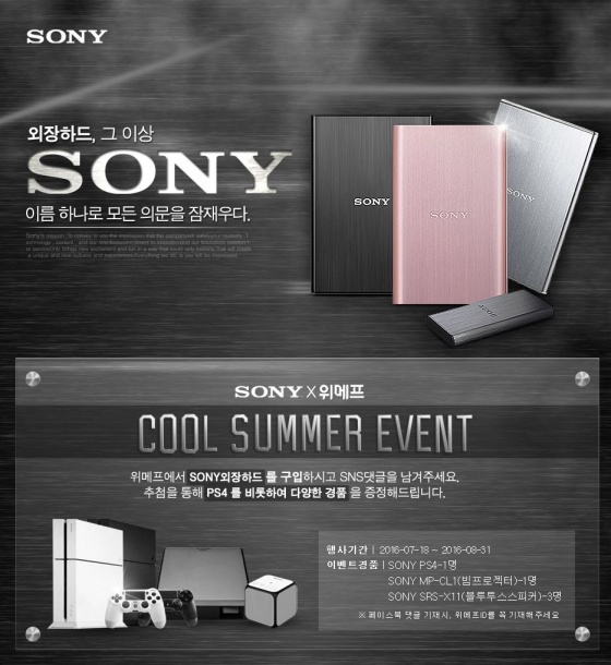 이번 소니 외장하드 판매를 기념하여 제품 구매 후 페이스북에 댓글과 위메프 ID를 남기면 추첨을 통해 'SONY PS4(플레이스테이션4 1명)', 'SONY MP-CL1'(빔 프로젝터 1명), 'SONY SRS-X11'(블루투스스피커 3명)을 증정하는 이벤트를 진행한다. 자세한 내용은 기획전 페이지에서 확인 가능하다.