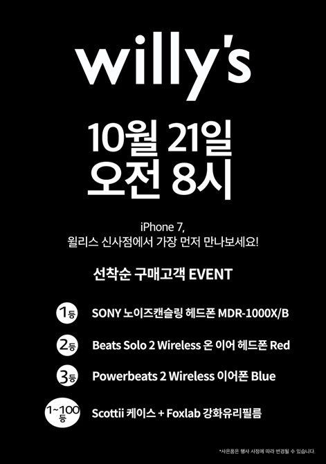 10월 14일(금)부터 홈페이지 및 모바일을 통해 iPhone 7/iPhone 7 Plus에 대한 사전 예약을 진행한 윌리스는, iPhone 7/iPhone 7 Plus 출시를 기념해 론칭 당일인 21일(금), 윌리스 신사점을 오전 8시 조기 오픈할 예정으로 선착순 구매 고객 100명에게 다양한 경품을 제공하는 '얼리버드' 프로모션을 진행한다. 이번 프로모션의 경품은 소니 MDR-1000X 와이어리스 헤드폰(1등), Beats Solo 2 와이어리스 헤드폰(2등), PowerBeats2 와이어리스 이어폰(3등) 및 선착순 100명 전원에게 Scottii iPhone 케이스와 Foxlab 강화유리 필름 및 지니뮤직 이용권을 제공하는 등 매우 풍성하게 마련됐다.