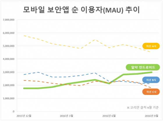 실제로 알약 안드로이드는 이 같은 성장세에 힘입어, 약 1년 만에 2종의 외산 제품을 따돌리고 국내 모바일 보안앱 분야 2위까지 점유율 순위를 높였다.
